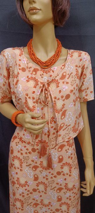 100% rayonne. Boléro fermé par un bouton coco.Le tissu est imprimé selon le procédé artisanal traditionnel du Batik pour des couleurs et des motifs d’une profondeur exceptionnelle. Peut se porter avec la Robe Mi longue Sama et la Robe Courte Evana.