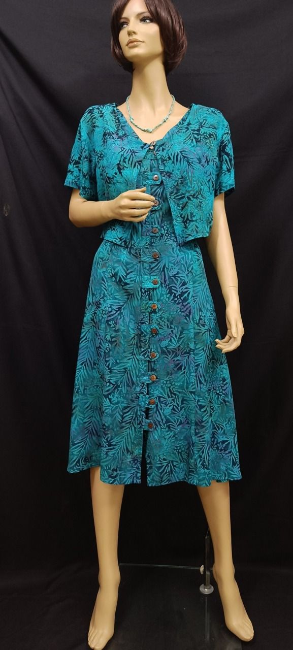 Robe en rayonne belle qualité, fraîche et confortable. Coupe évasée de type « princesse ». Boutonnage original sur le devant. Brides dans le dos pour resserrer la taille. Teinture réalisée en batik traditionnel. Arrive à mi-mollets. Boléro optionnel.