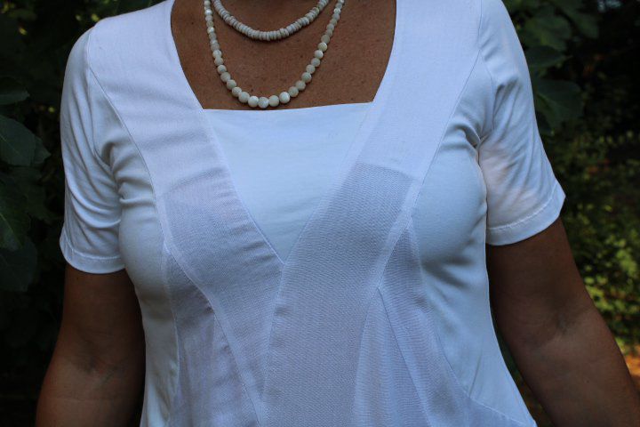 Robe mi longue arrivant sous le genou, originalement travaillée avec une alliance ingénue entre matière tee shirt et lin/rayonne.